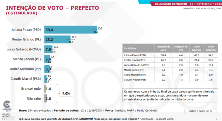 Faltando 21 dias para as eleições de 6 de outubro o Institto MAPA divulgou na manhã desta segunda feira (16) o resultado da segunda pesquisa contratada pela Rádio Camboriú, que aponta a candidata da Coligação “Juntos Por Toda Balneário Camboriú, Juliana Pavan (PSD), com considerável diferença de votos sobre o segundo colocado, Peeter Grando que acumula também o perfil do candidato mais rejeitado na opinião dos eleitores de Balneário Camboriú.