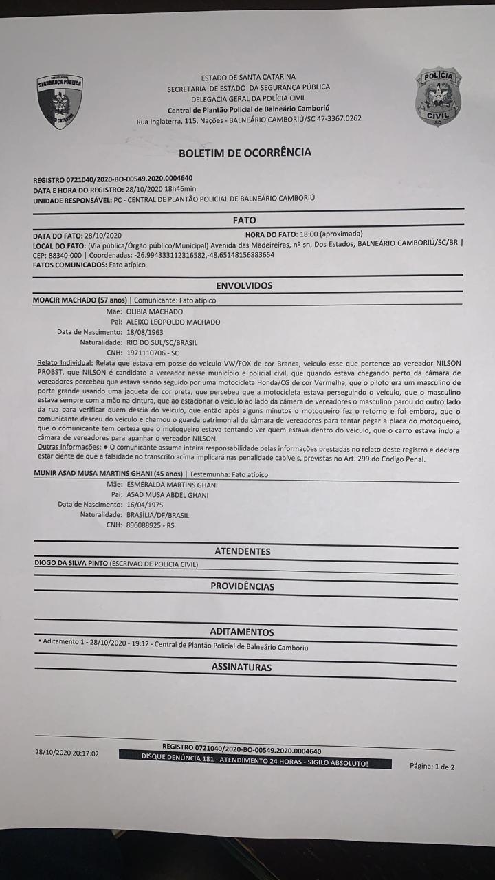 Um caso suspeito ocorreu no início da noite desta quarta-feira (28), e foi relatado no plantão da Polícia Civil por Moacir Machado, 57 anos, que foi perseguido por um motoqueiro até chegar ao estacionamento da Câmara Municipal de Vereadores.