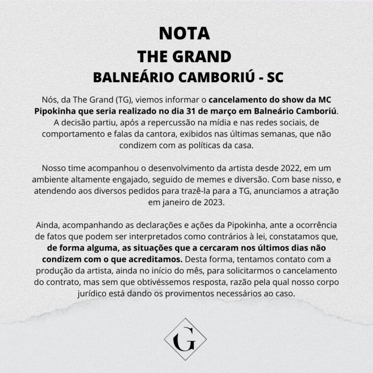 A casa noturna The Grand, em Balneário Camboriú, emitiu uma nota nesta sexta-feira (10), comunicando o cancelamento do show com a MC Pipokinha, que ocorreria no dia 31 de março. De acordo com os representantes da balada, a decisão ocorreu pela casa não compactuar com as atitudes da artista nas últimas semanas.
