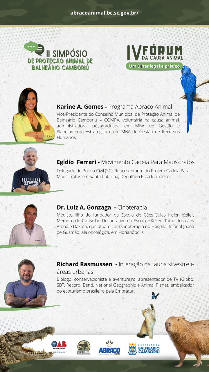 Um dos palestrantes será o biólogo, conservacionista e apresentador de TV Richard Rasmussen (veja no fim do texto quem são os demais palestrantes). O evento é destinado a pessoas interessadas na defesa animal, lideranças comunitárias, agentes multiplicadores do conteúdo, profissionais da área veterinária e terceiro setor vinculado à causa. No simpósio, serão abordadas as políticas públicas do Programa Abraço Animal, bem como ações de defesa animal desenvolvidas em Santa Catarina. Também estará na pauta a cinoterapia e sua execução na prática (método que utiliza cães ou outros animais em sessões de terapia). O enfrentamento de demandas relacionadas à fauna silvestre em áreas urbanas será outro tema discutido.