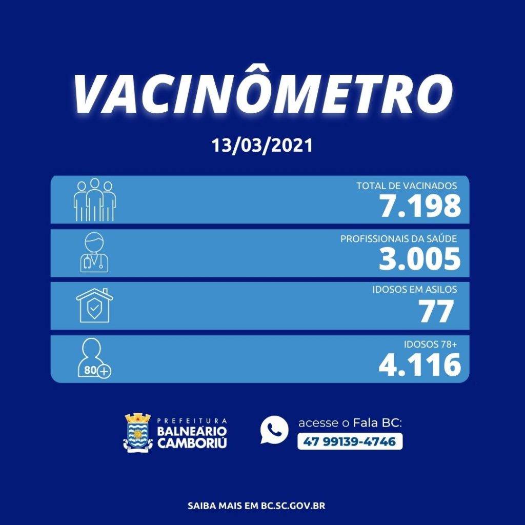 Ao todo, 7198 pessoas já foram vacinadas com a primeira dose, destes, 3.005 profissionais da saúde, 4.116 idosos com 78 anos ou mais e 77 idosos residentes em Instituições de Longa Permanência. Balneário Camboriú já aplicou 1.849 unidades da segunda dose da vacina contra o Coronavírus.