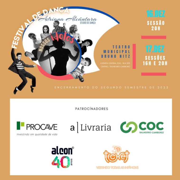 O Studio de Dança Adriana Alcântara apresenta o novo espetáculo de encerramento do segundo semestre de 2022 que tem como tema homenagear ídolos da música, dança, poesia nacional e internacional: entre eles destacam-se sucessos consagrados de Vinicius de Moraes a Beethoven; Marisa Monte a Madona, Xuxa a Beyonce e muito mais. Os ídolos serão homenageados através dos mais diversos estilos de dança: Do balé clássico ao jazz, hip hop, contemporâneo, dança de salão, baby class e dança do ventre. As sessões acontecem no dia 16/12 as 20:00 e 17/10 as 16:00 e 20:00, no Teatro Municipal Bruno Nitz em Balneário Camboriú.