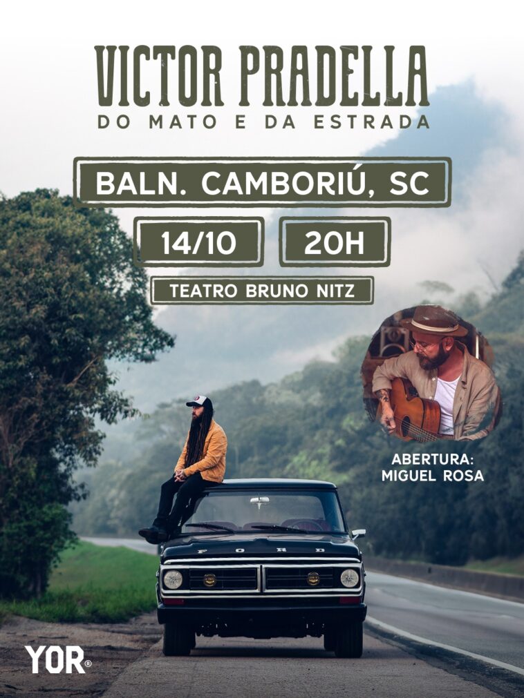 O cantor e músico Victor Pradella apresenta o show “Do Mato e da Estrada” no Teatro Municipal Bruno Nitz, em Balneário Camboriú, nesta terça-feira (14), às 20h. Os ingressos estão à venda pelo site www.clubedoingresso.com ou pelo link https://www.clubedoingresso.com/evento/victorpradella-aovivodomatoedaestrada.