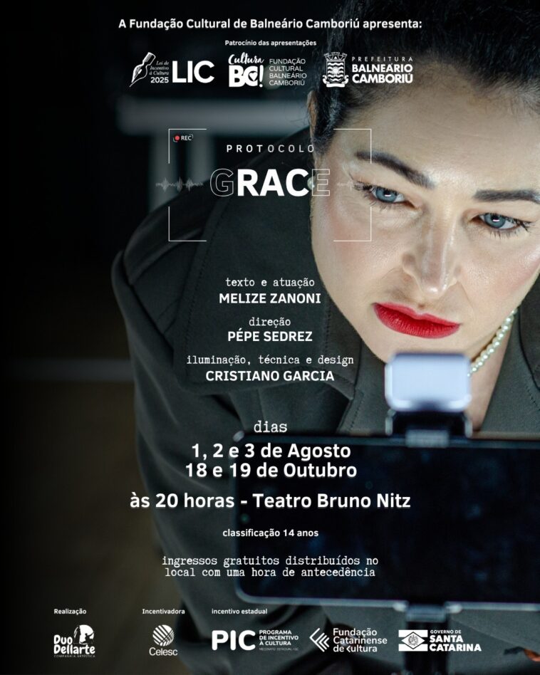 Abrindo a agenda do mês, o monólogo “Protocolo Grace” será apresentado nesta sexta-feira (1º), sábado (2) e domingo (3), às 20h, com entrada gratuita. Patrocinado pela Lei de Incentivo à Cultura de Balneário Camboriú (LIC), o monólogo é realizado pela Duo Dellarte Cia. Artística. Escrito e representado pela atriz e dramaturga Melize Zanoni, “Protocolo Grace” aborda a relação entre a mentira e a verdade (saiba mais sobre o espetáculo no link https://abre.ai/nfc5).