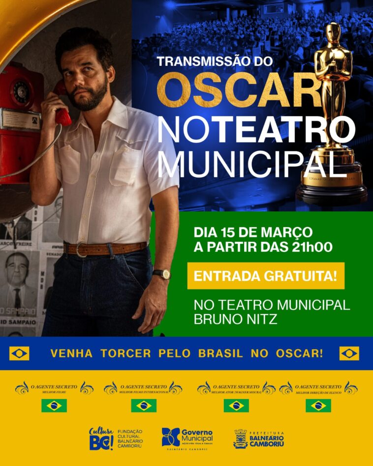 Pelo segundo ano consecutivo, o Teatro Municipal Bruno Nitz, de Balneário Camboriú, vai transmitir a cerimônia de entrega do Oscar, que ocorrerá em Los Angeles (EUA) domingo (15). O espaço cultural entra no clima da maior premiação do cinema internacional e de torcida pelo Brasil a partir das 21h. A transmissão será por um telão, com entrada gratuita.