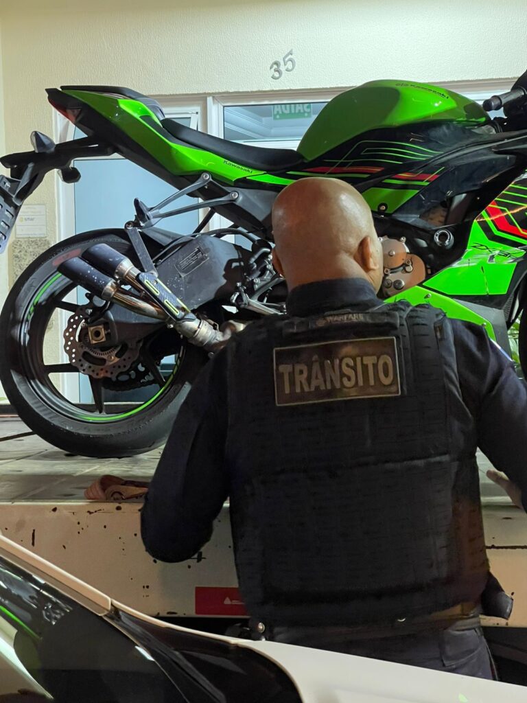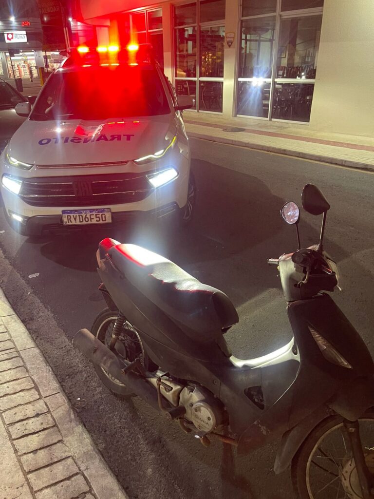 Por volta das 19h30, uma motocicleta foi interceptada na Rua 1500 devido ao escapamento adulterado. Durante a fiscalização, constatou-se que o veículo apresentava licenciamento em aberto e acumulava diversas multas, somando aproximadamente R$ 3 mil em débitos.