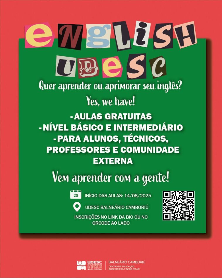 A Universidade do Estado de Santa Catarina (UDESC) em Balneário Camboriú está com inscrições abertas para aulas gratuitas de inglês com vagas destinadas também à comunidade externa. A iniciativa visa ampliar o acesso ao ensino de idiomas e fortalecer a integração da universidade com a sociedade local.