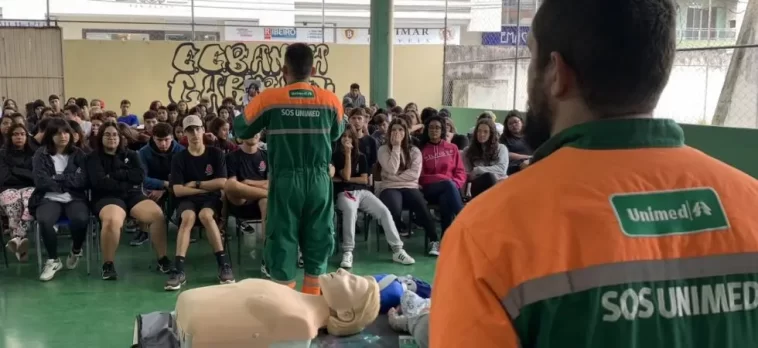 As aulas de primeiros socorros, ministradas presencialmente, são complementadas com vídeos sobre cada tema específico, que podem ser acessados neste link https://site.unimedlitoral.com.br/uniescolas/.