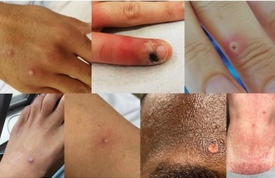 O principal sintoma é a aparição de lesões na pele parecidas com espinhas. As lesões podem aparecer em qualquer lugar do corpo, mas comumente no rosto, boca, pés, mãos, peito e região genital. Além disso, podem ocorrer dor de cabeça, febre, dores musculares e fraqueza.