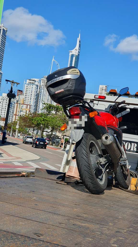 Na manhã de domingo (19), durante patrulhamento, a guarnição dos Agentes de Trânsito identificou uma motocicleta Honda/CB 300R estacionada sobre marcas de canalização na Avenida Atlântica, região da Barra Sul.