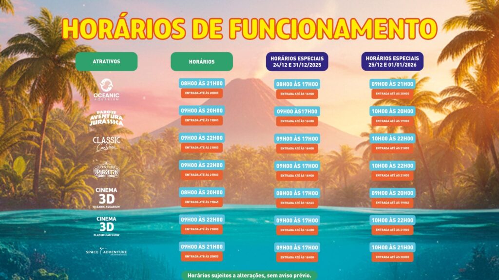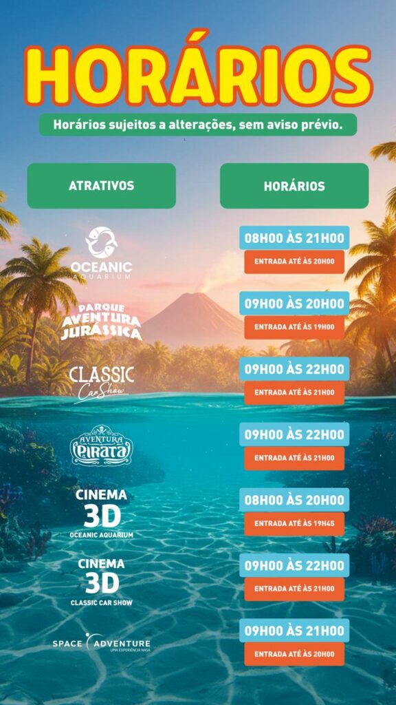 O Parque Aventura Jurássica recebe o público até as 20h. Já o Oceanic Aquarium e o Space Adventure funcionam até as 21h, enquanto o Classic Car Show e a Aventura Pirata permanecem abertos até as 22h. A bilheteria encerra as vendas sempre uma hora antes do fechamento. Todos os atrativos abrem a partir das 9h, com exceção do aquário, que inicia as atividades às 8h.