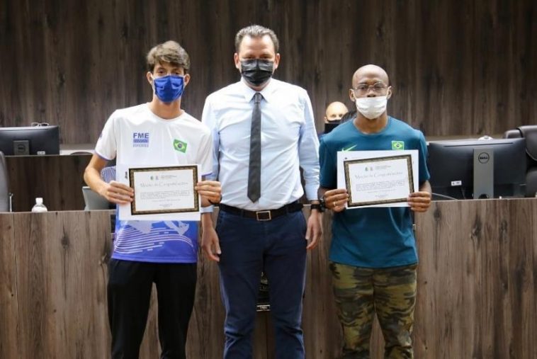 O vereador Alessandro Teco (Republicanos), homenageou na última sessão, os atletas Douglas Hernandes Mendes da Silva e Victor Augusto Carpeggiani, da Fundação Municipal de Esporte de Balneário Camboriú – FME, pelos seus expressivos resultados conquistados no Atletismo, obtendo destaque nacional e internacional em suas categorias.