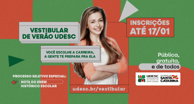 Até as 23h59 de segunda-feira, 17, a Universidade do Estado de Santa Catarina (Udesc) ficará com inscrições gratuitas abertas para o Vestibular de Verão 2022, que terá processo seletivo especial, sem aplicação de provas.